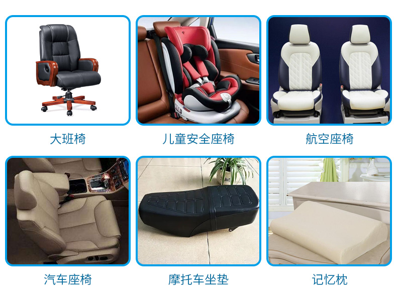 用于汽車坐墊、記憶頭枕、摩托車座墊、自行車鞍座、辦公座椅、汽車扶手、兒童安全座椅等領域。