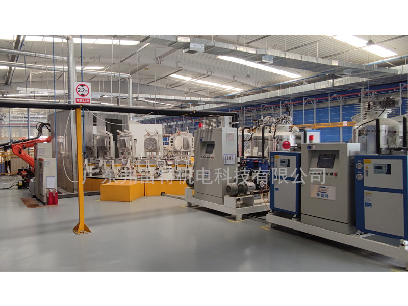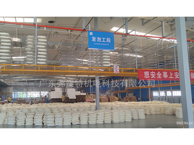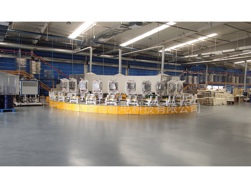 生產(chǎn)線需二人就可完成,產(chǎn)量高、速度快。生產(chǎn)線主要配備:上位工控機(jī)、掃碼讀碼系統(tǒng)、全自動模具模架、機(jī)器人、可變比例發(fā)泡機(jī)、預(yù)混站、真空破泡機(jī)等,各個設(shè)備由系統(tǒng)連接,具有自動糾正、報警等功能。