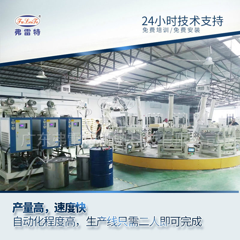 生產(chǎn)線需二人就可完成,產(chǎn)量高、速度快。生產(chǎn)線主要配備:上位工控機(jī)、掃碼讀碼系統(tǒng)、全自動(dòng)模具模架、機(jī)器人、可變比例發(fā)泡機(jī)、預(yù)混站、真空破泡機(jī)等,各個(gè)設(shè)備由系統(tǒng)連接,具有自動(dòng)糾正、報(bào)警等功能。