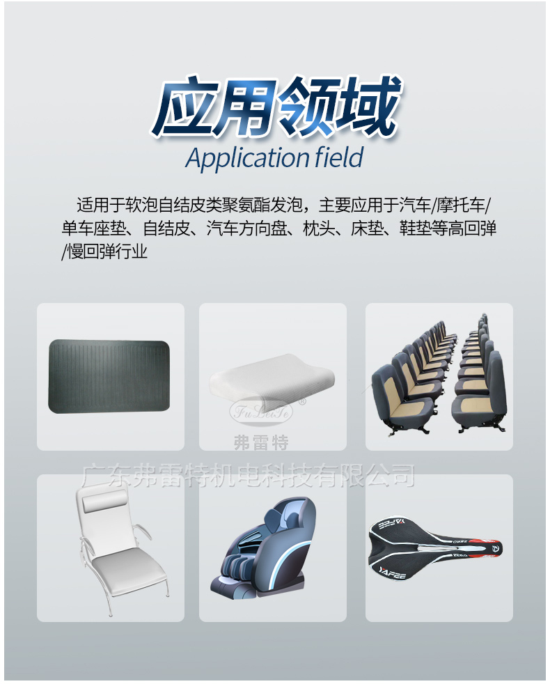 適用于軟泡自結皮類聚氨酯發(fā)泡,主要應用于汽車/摩托車/單車座墊、自結皮、汽車方向盤、枕頭、床墊、鞋墊等高回彈/慢回彈行業(yè)。