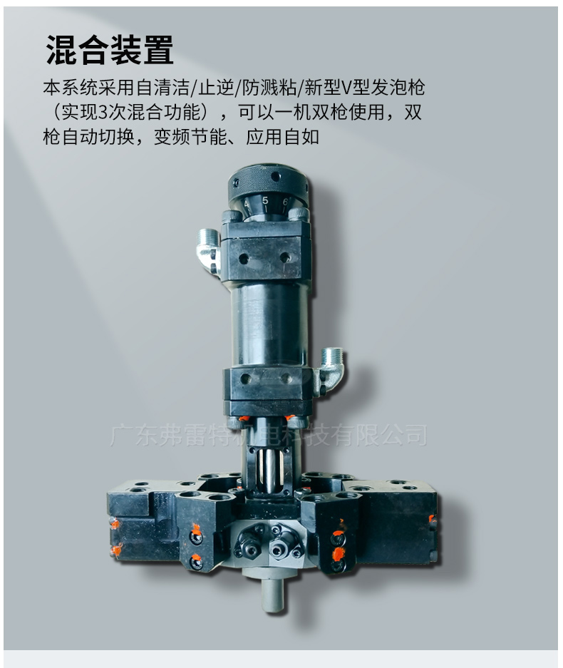 混合裝置:本系統(tǒng)采用自清潔/止逆/防濺粘/新型V型(實(shí)現(xiàn)3次混合功能)發(fā)泡槍,結(jié)構(gòu)美觀、操作方便。配合西門(mén)子聚氨酯專用泵,注射準(zhǔn),混合效果很好。