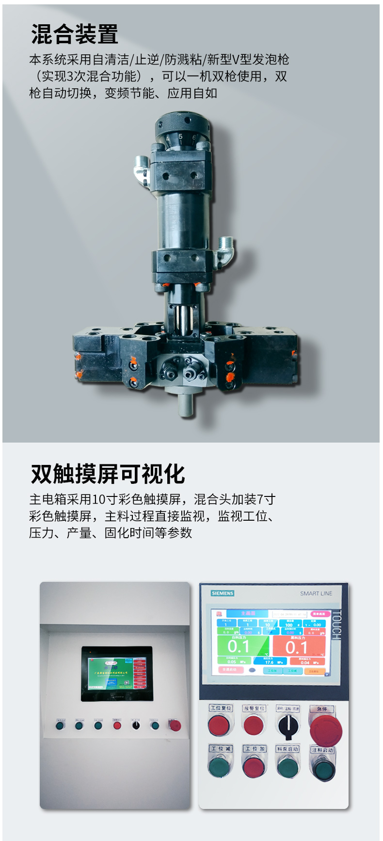 4、混合裝置: 采用自清潔/止逆/防濺粘/新型V型(實(shí)現(xiàn)3次混合功能)發(fā)泡槍?zhuān)Y(jié)構(gòu)美觀,操作方便。配合西門(mén)子聚氣醋專(zhuān)用泵,注射準(zhǔn)確,混合效果好。