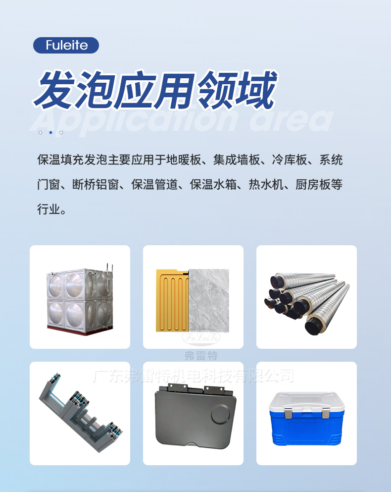 用于保溫填充類聚氨酯制品發(fā)泡,例如:地暖板、集成墻板、冷庫(kù)板、保溫板、保溫箱、保溫水箱、熱水器、廚房板、蒸飯柜等行業(yè)。