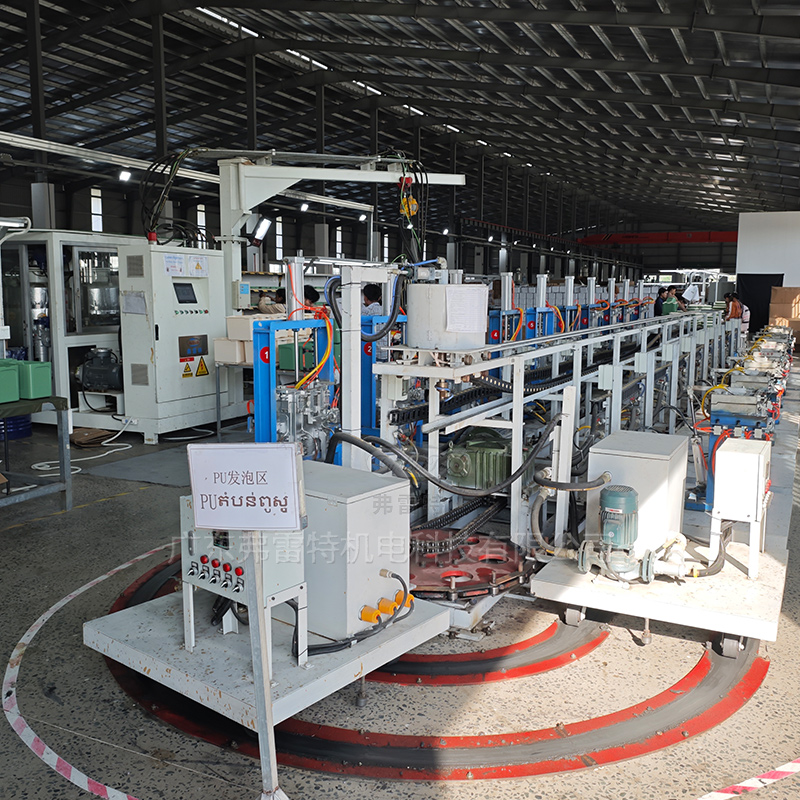 聚氨酯保溫箱自動(dòng)化發(fā)泡機(jī)生產(chǎn)線。應(yīng)用領(lǐng)域包括車載保溫箱、釣魚(yú)保溫箱、小冰箱等等。聚氨酯發(fā)泡機(jī)生產(chǎn)線配套了弗雷特環(huán)戊烷發(fā)泡機(jī),設(shè)置了安全防靜電圍房,無(wú)氟發(fā)泡及環(huán)戊烷安全檢測(cè),警報(bào)及處理系統(tǒng),令環(huán)戊烷發(fā)泡機(jī)的使用變得更加安全和可靠。另外還搭配了發(fā)泡氣動(dòng)開(kāi)合模具模架,一鍵自動(dòng)開(kāi)合,節(jié)省人力,高效生產(chǎn)。