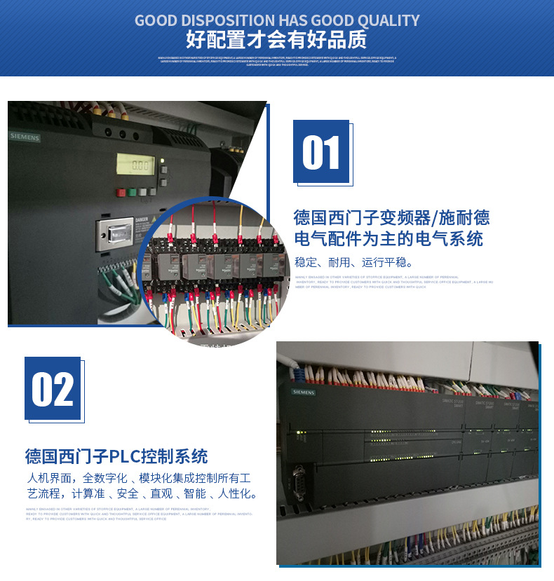 電氣控制:采用質(zhì)量可靠的配置,以西門子PLC、施耐德配件為主要基礎(chǔ)。