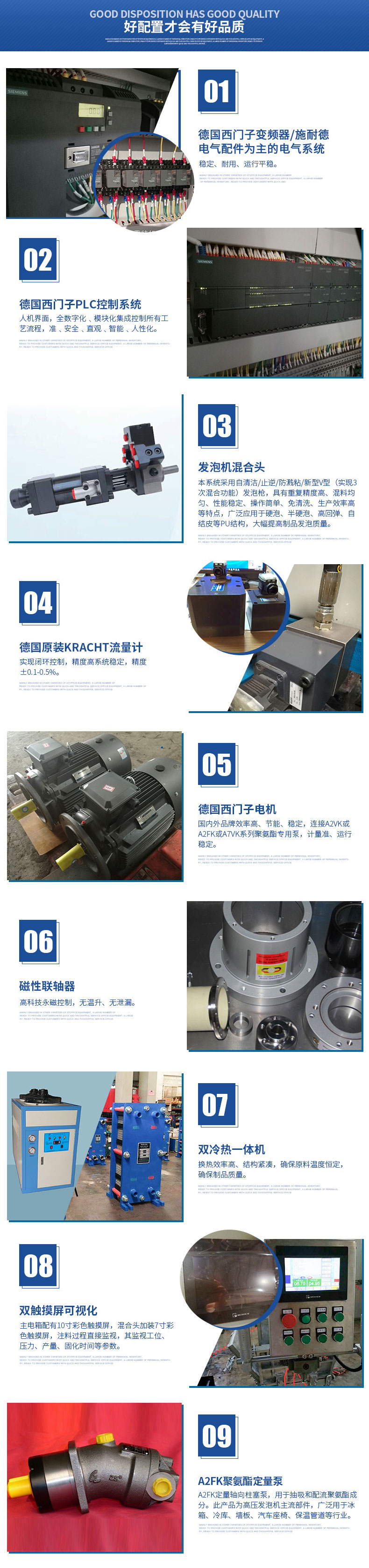 混合裝置:本系統(tǒng)采用自清潔/止逆/防濺粘/新型V型(實現(xiàn)3次混合功能)發(fā)泡槍,結構美觀、操作方便。配合西門子聚氨酯專用泵,注射準,混合效果很好。