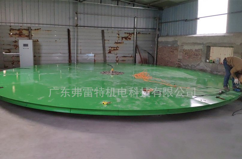 5.轉盤主結構骨架使用國標工字鋼,封閉結構,盤面保證平整不變形。中心承重座底部使用止推軸承負責承載,錐滾軸承保證定位,保證轉動的精度和可靠性。